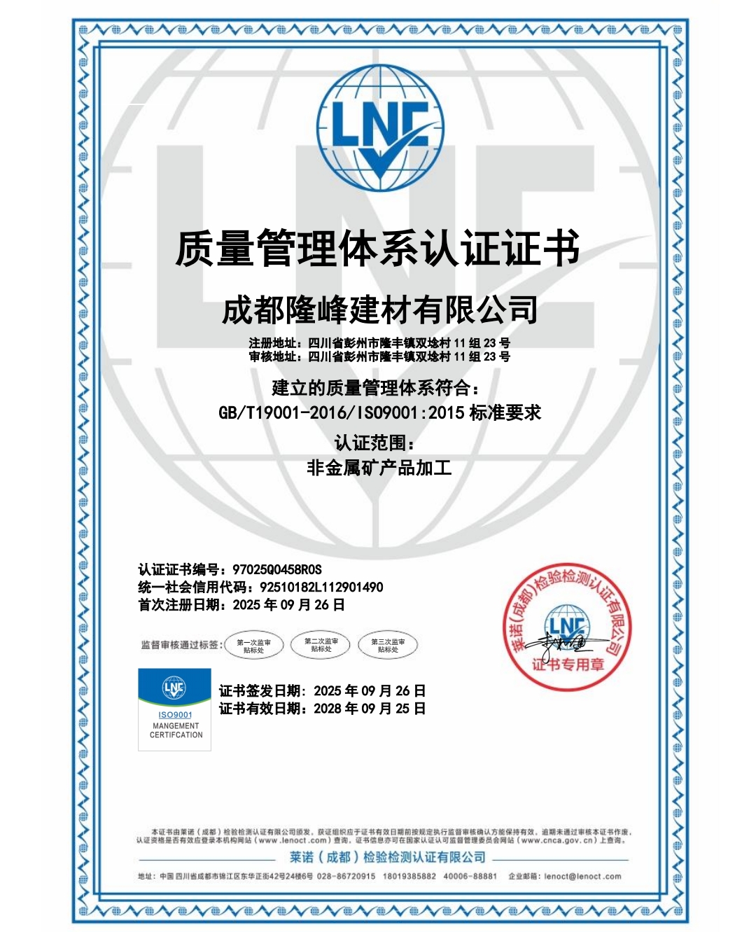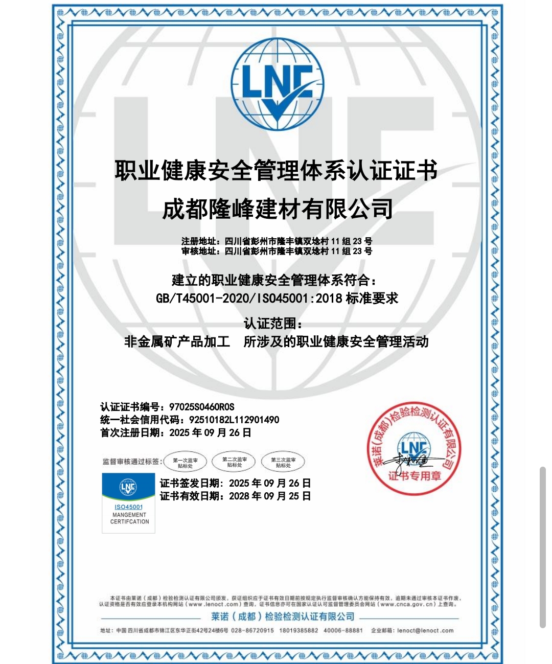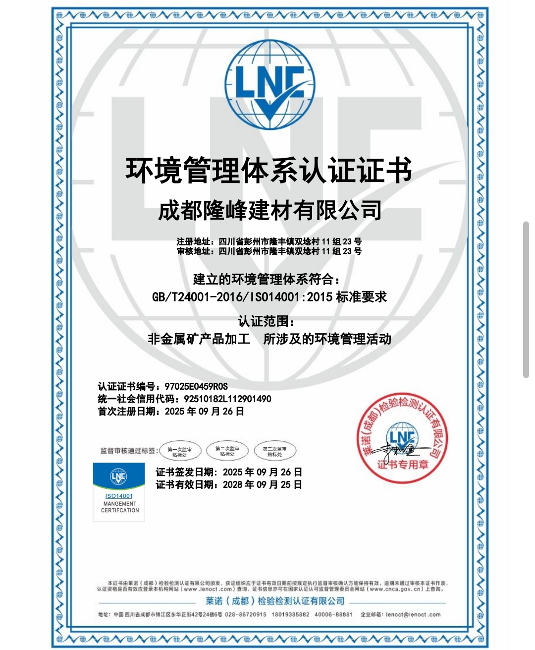 成都隆峰建材有限公司的环境管理体系认证证书,属于ISO三大体系认证之一(对应ISO14001标准,国标为GB/T24001-2016),核心信息及解读如下: